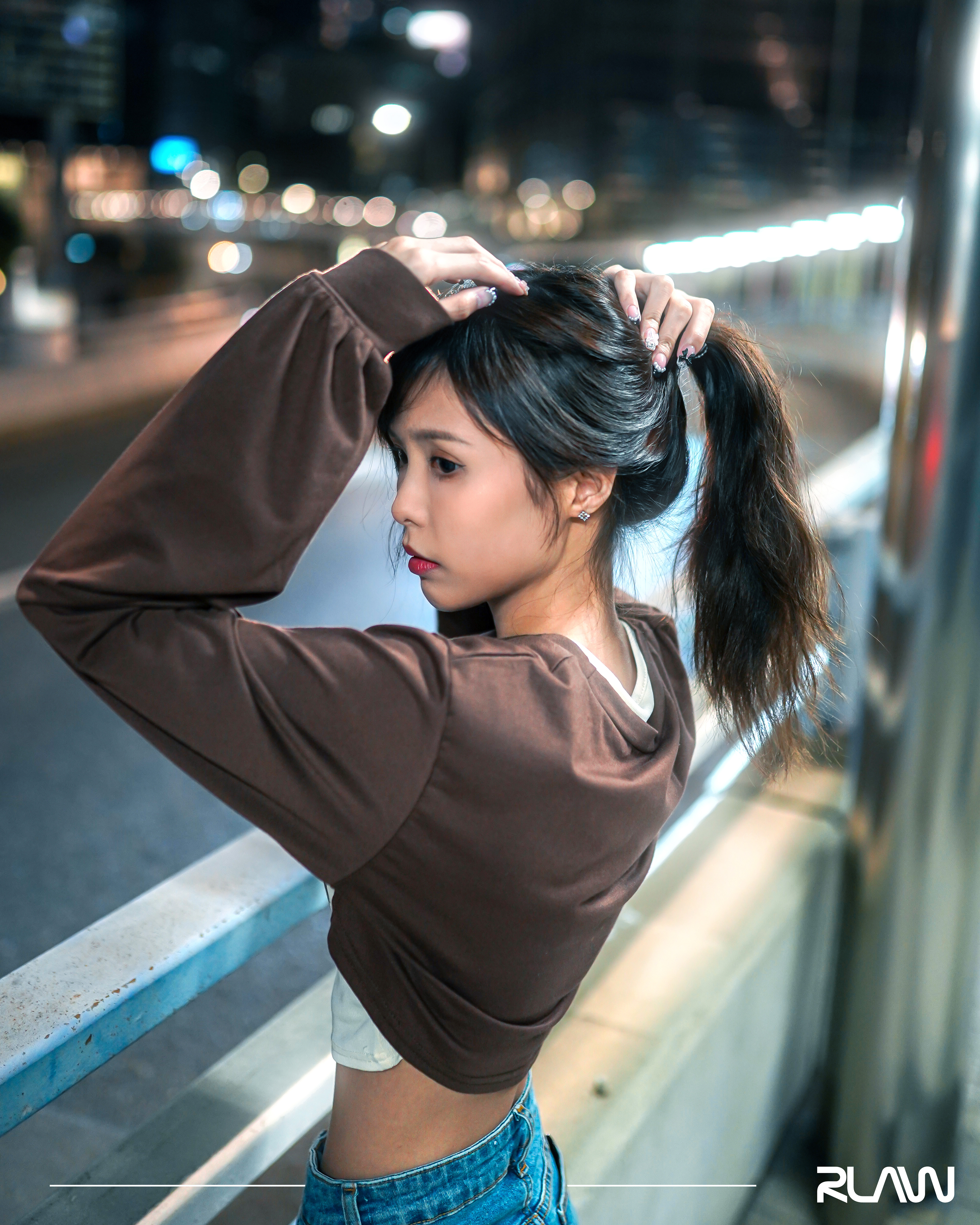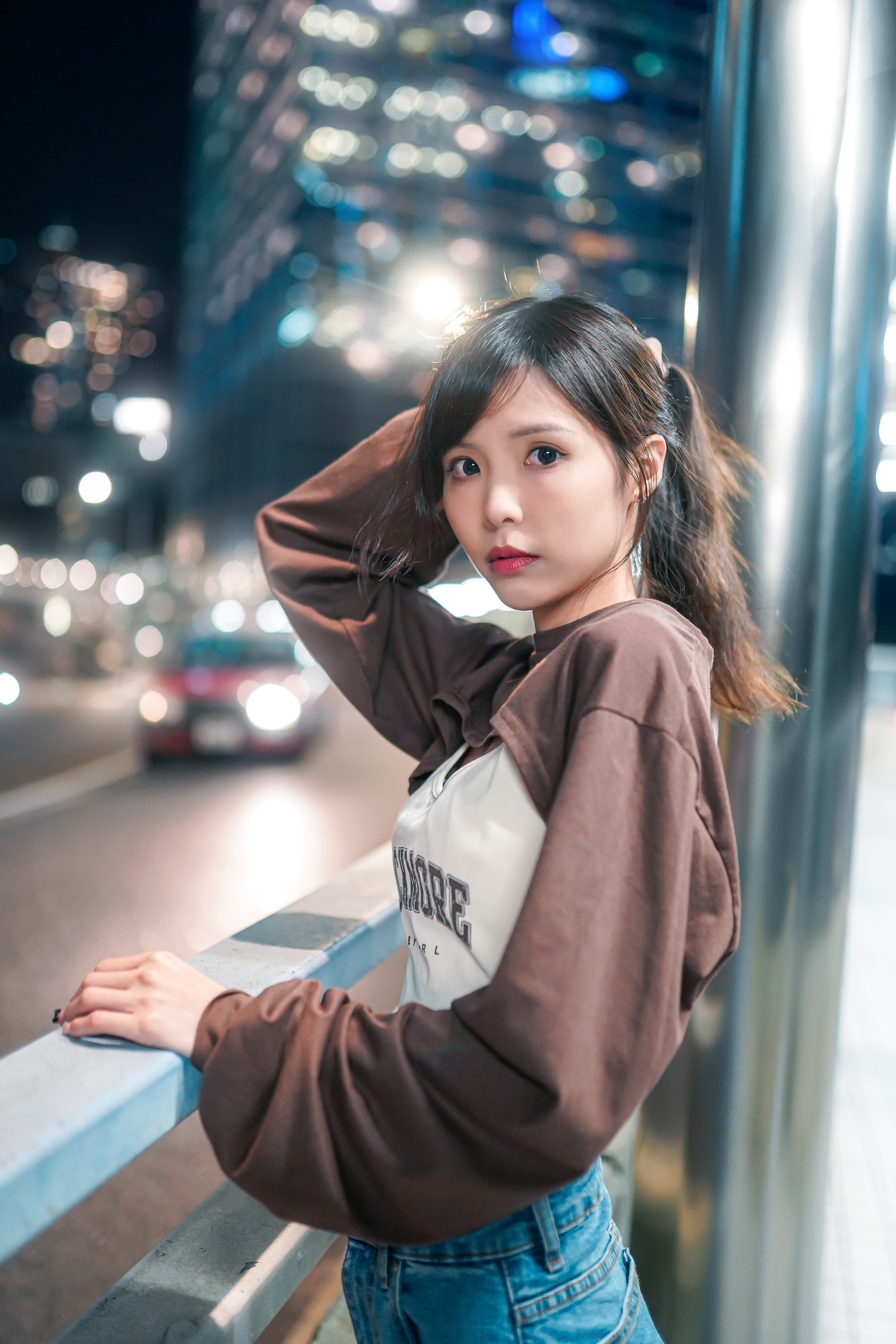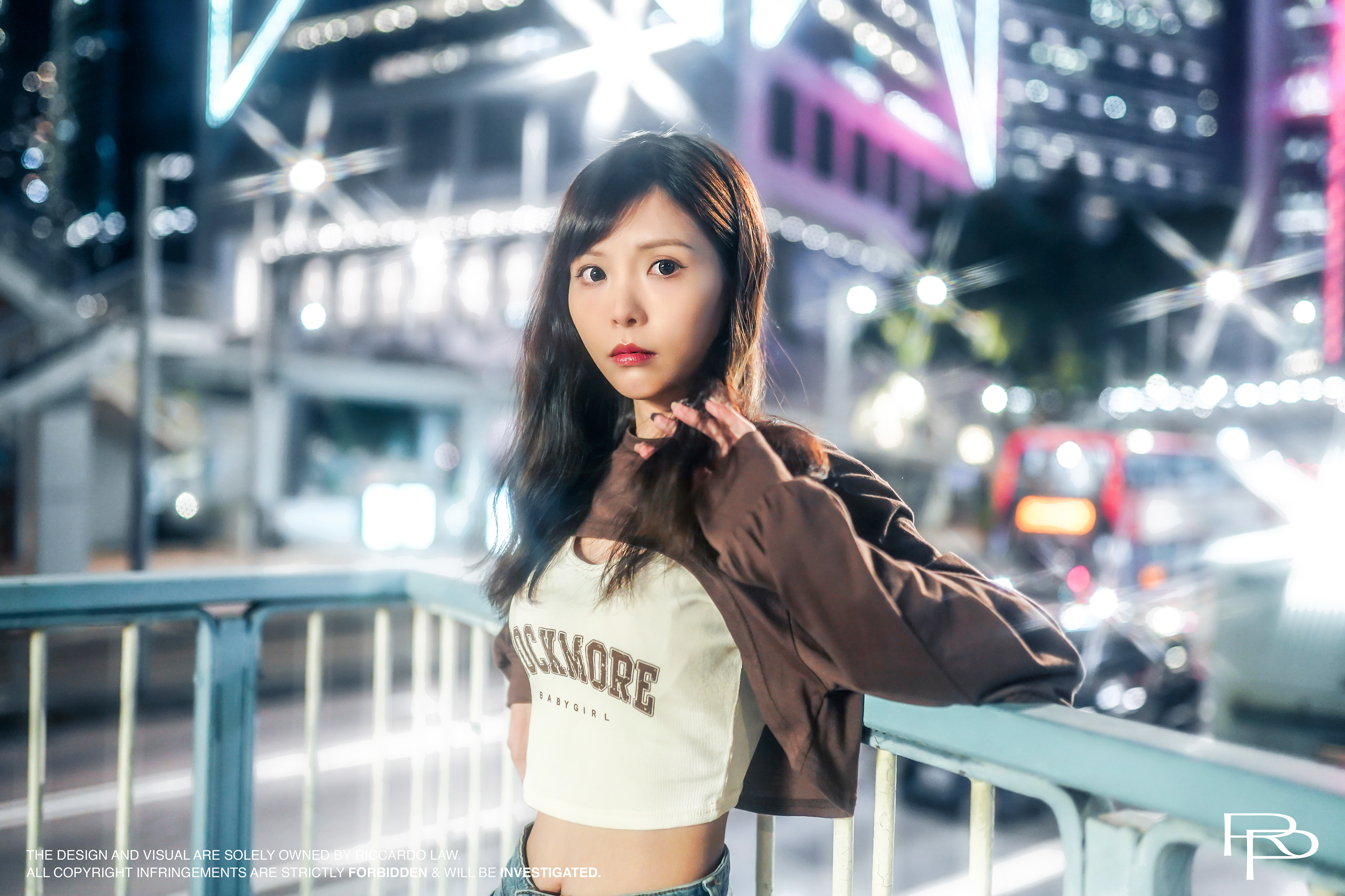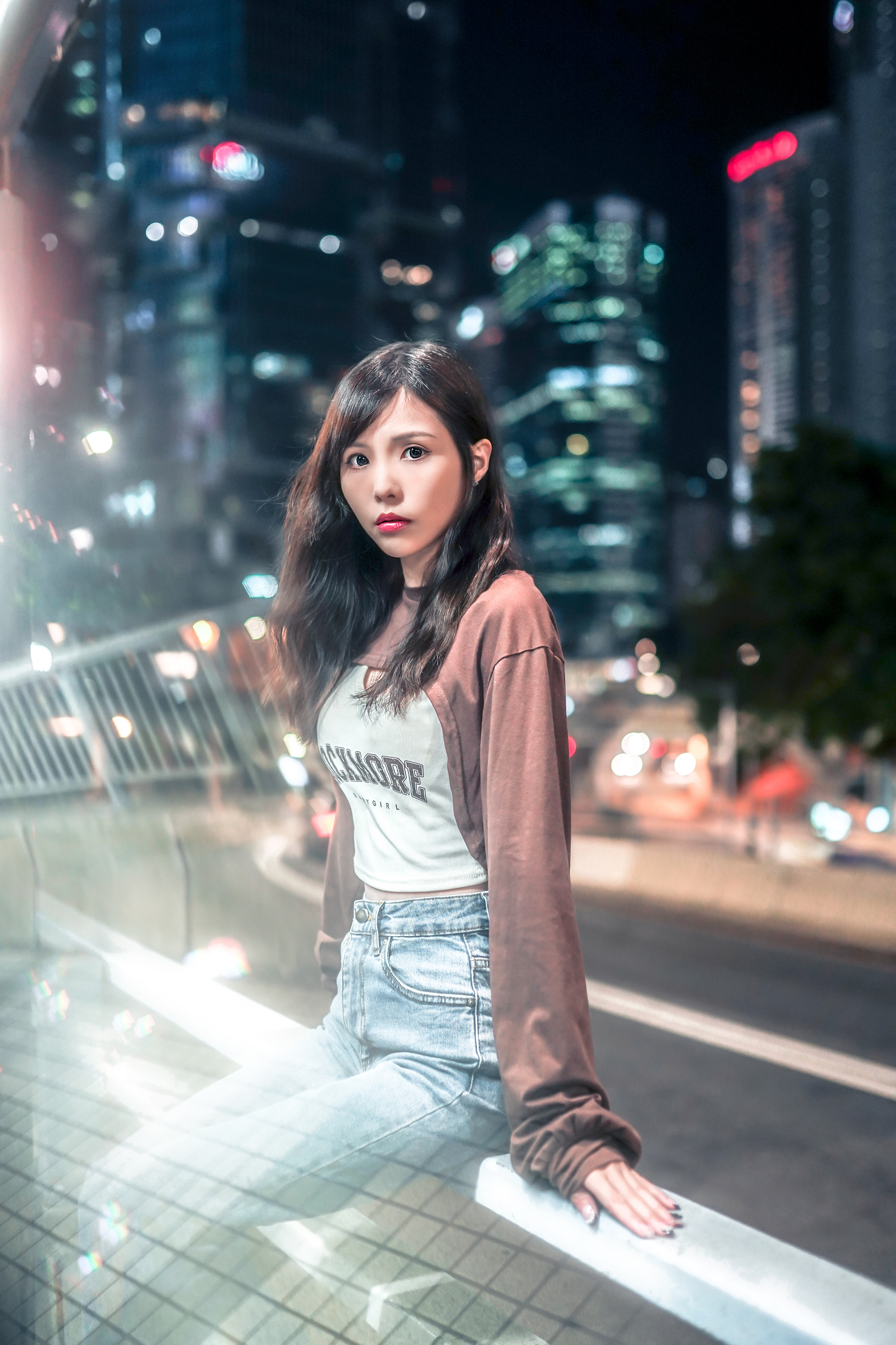 Under the flashy environment of the urban city, with reflections and ultra-surrounded flashes, creating a bokeh-heavy imagery.