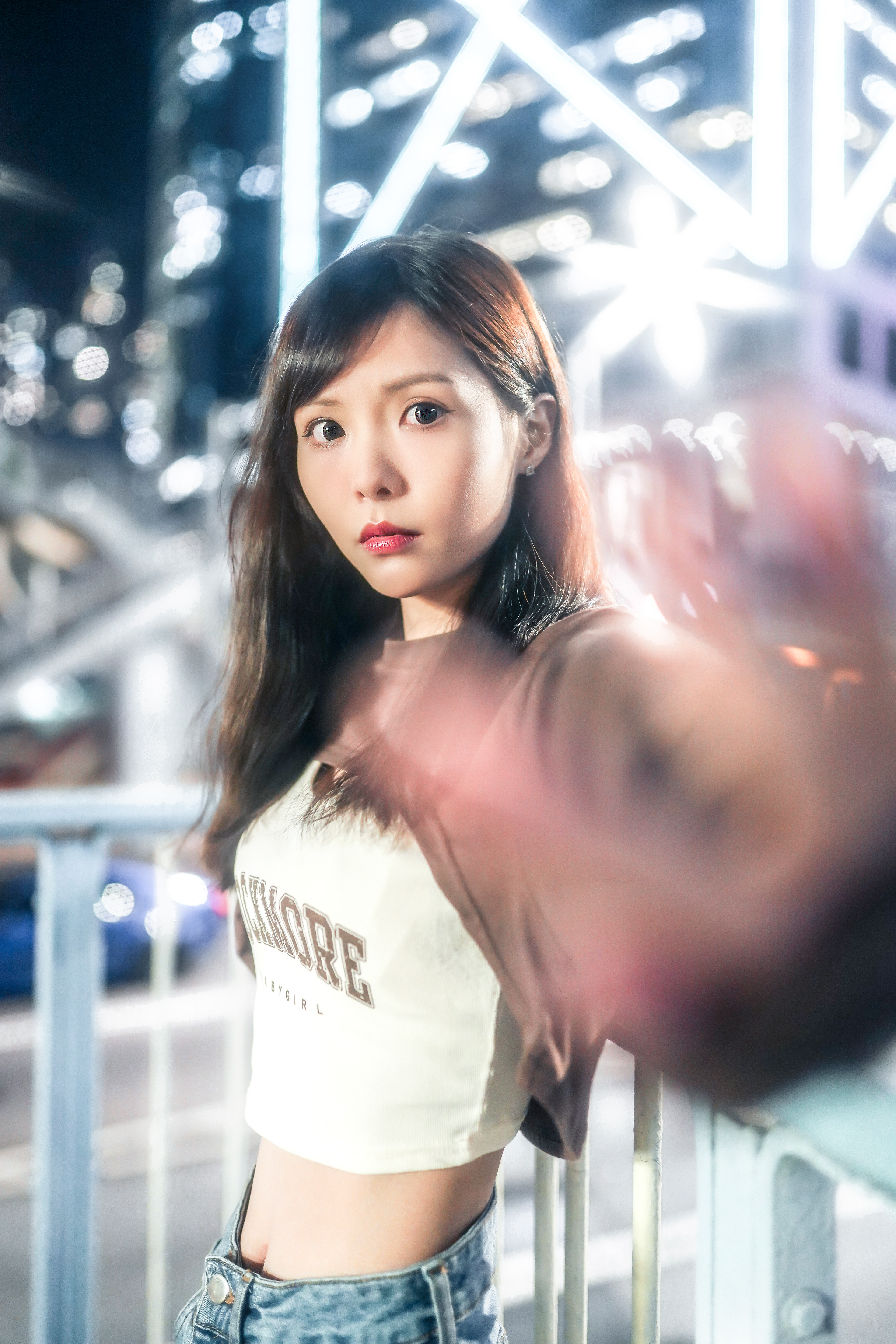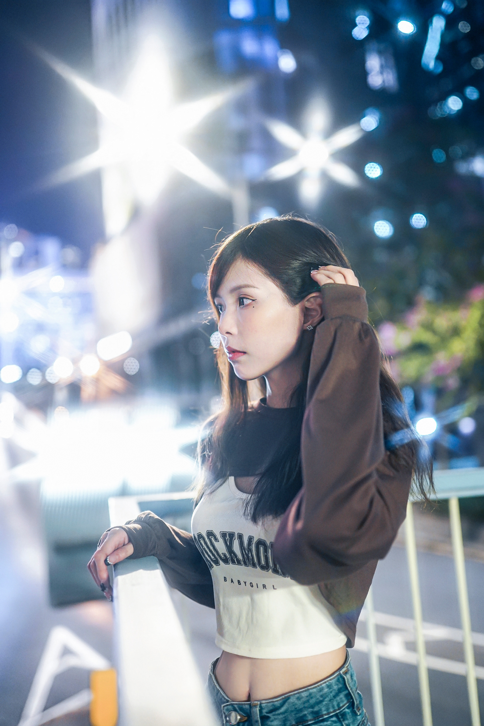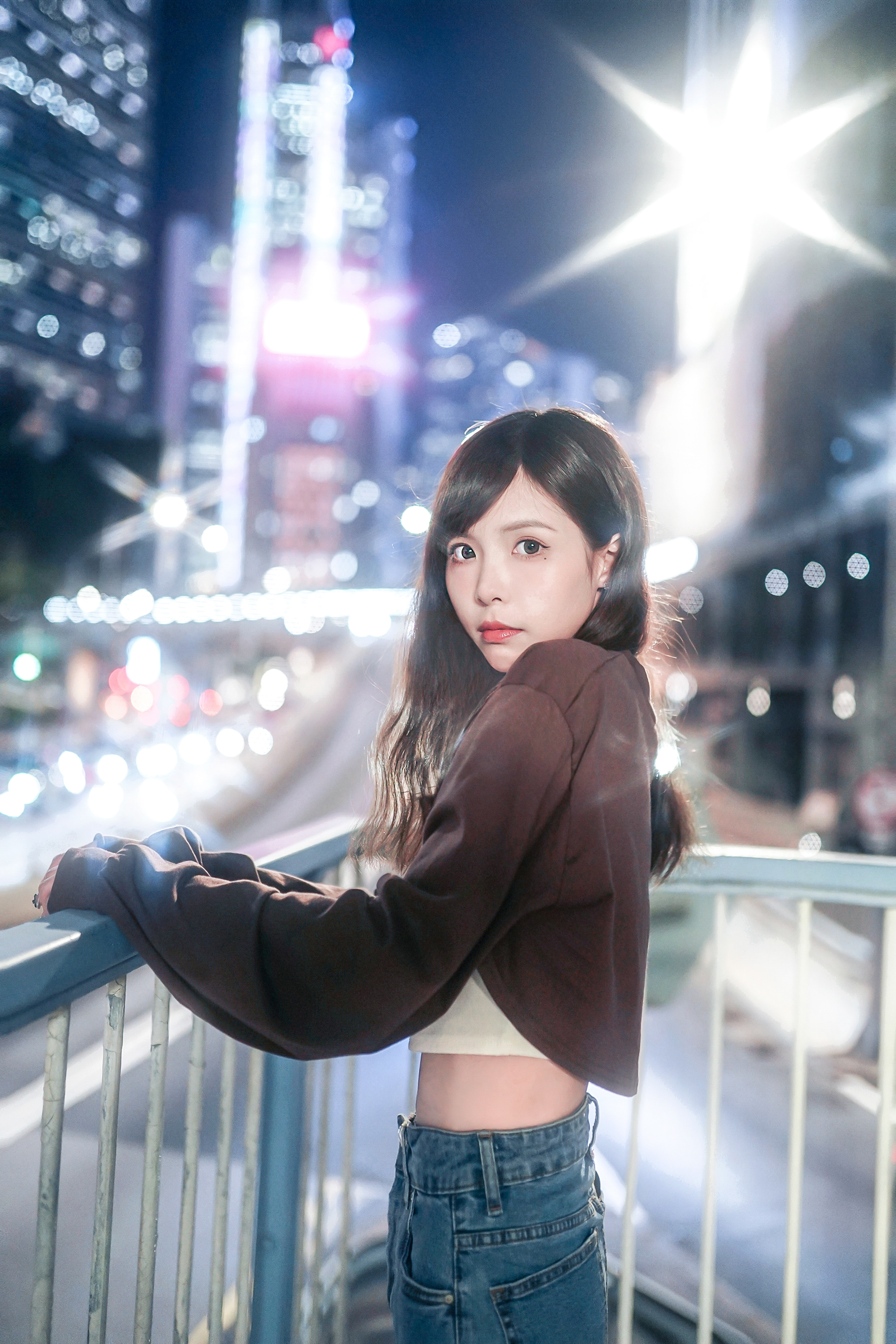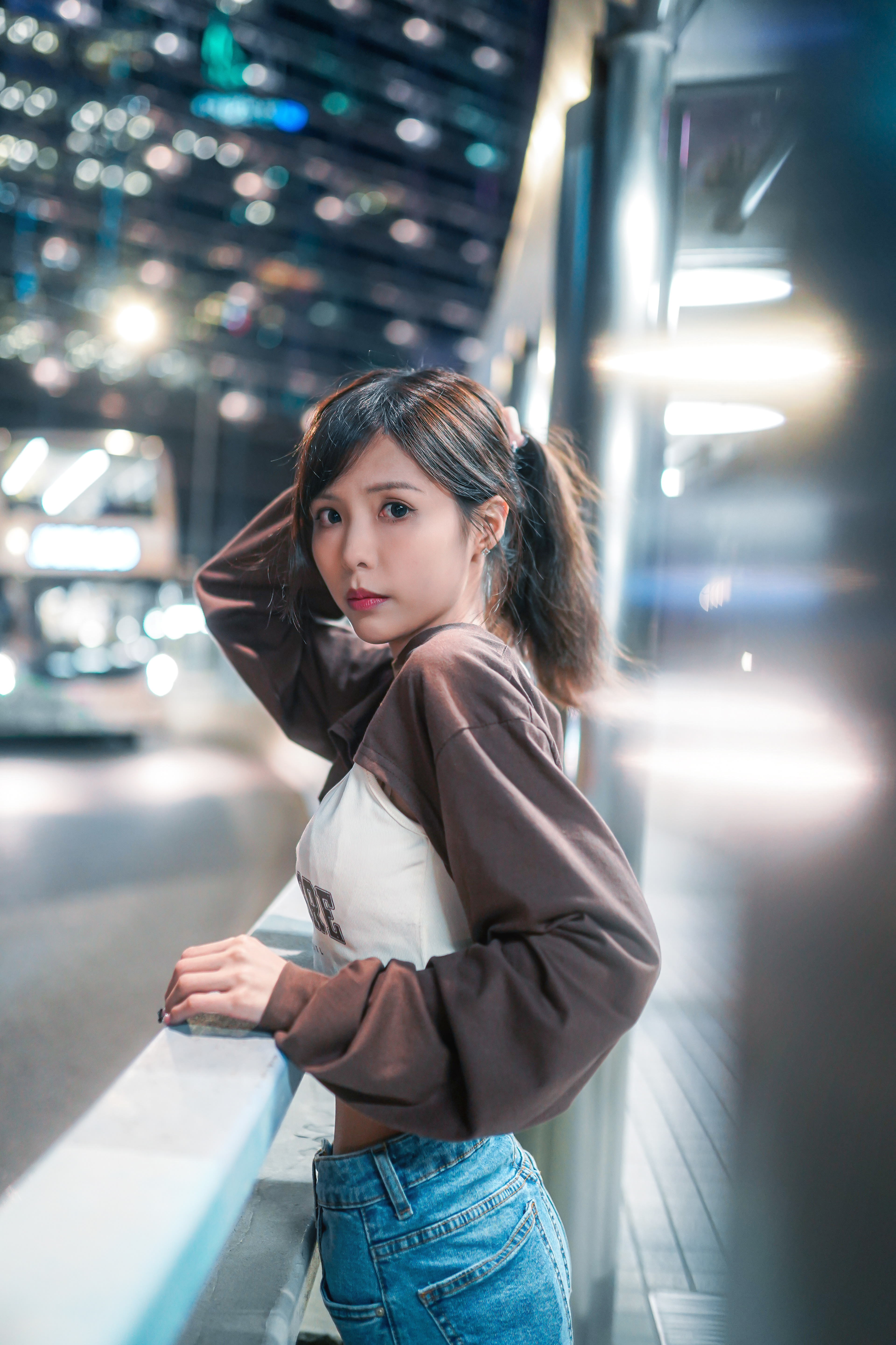 Under the flashy environment of the urban city, with reflections and ultra-surrounded flashes, creating a bokeh-heavy imagery.